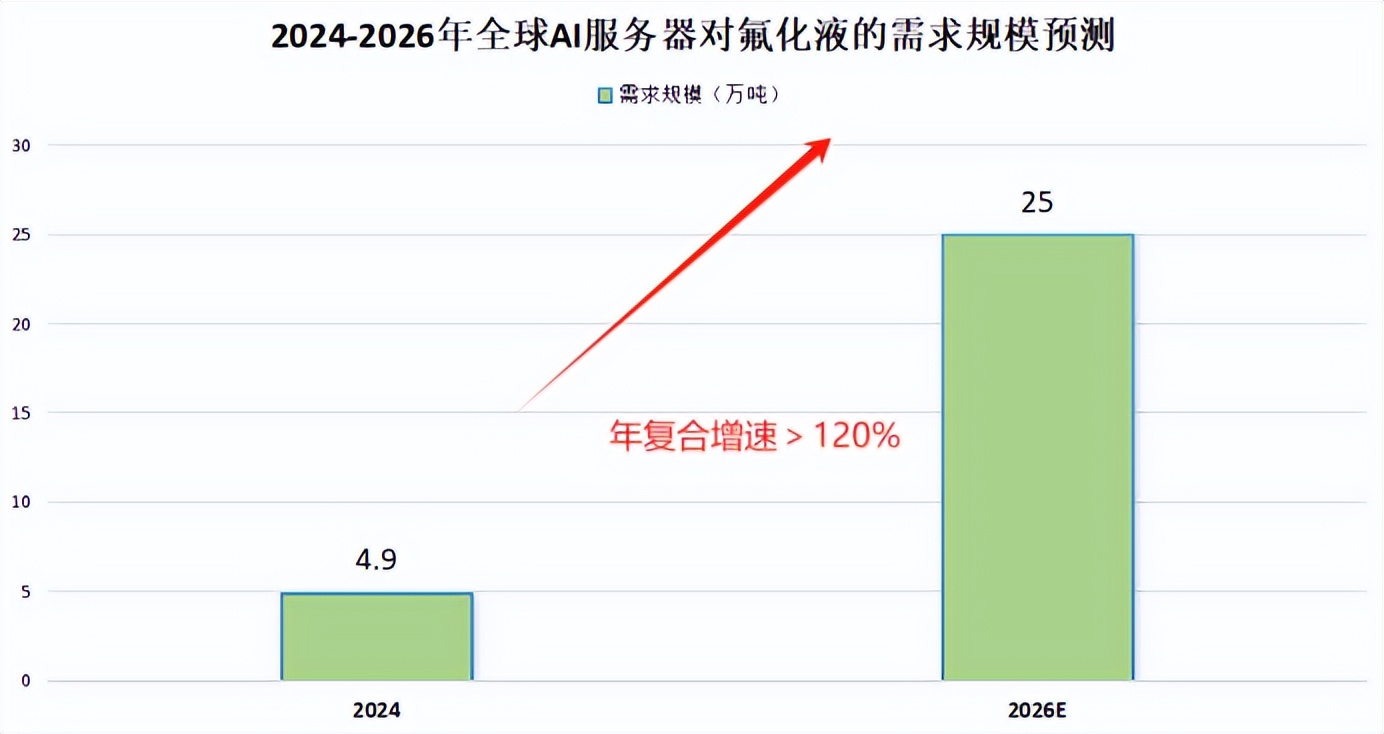 预计到2026年,全球AI服务器用的氟化液需求超过25万吨,2024-2026年的年复合增速超过120%。可见氟时代,已然到来!