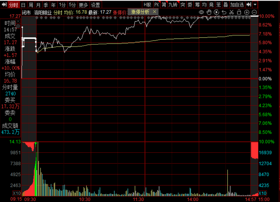 $洛阳钼业(SH603993)$:铜+钴+黄金+稀土永磁。公司基本面扎实,其全球资源布局突出,刚果金的铜钴项目产能持续释放,铜年产量65万吨跻身全球前十,钴资源占全球三成份额,近期收购厄瓜多尔金矿进一步拓展贵金属布局。昨日盘面表现强势,股价涨停收于17.27元,技术面看,MACD红柱放大且金叉延续,BOLL带上轨被击穿,均线系统呈多头排列,游资与散户资金积极承接,这里还有新高的空间。