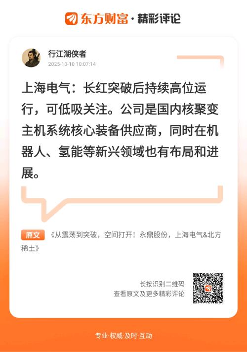老师的眼光厉害,方向拿捏得死死的。//@行江湖侠者 :上海电气:长红突破后持续高位运行,可低吸关注。公司是国内核聚变主机系统核心装备供应商,同时在机器人、氢能等新兴领域也有布局和进展。