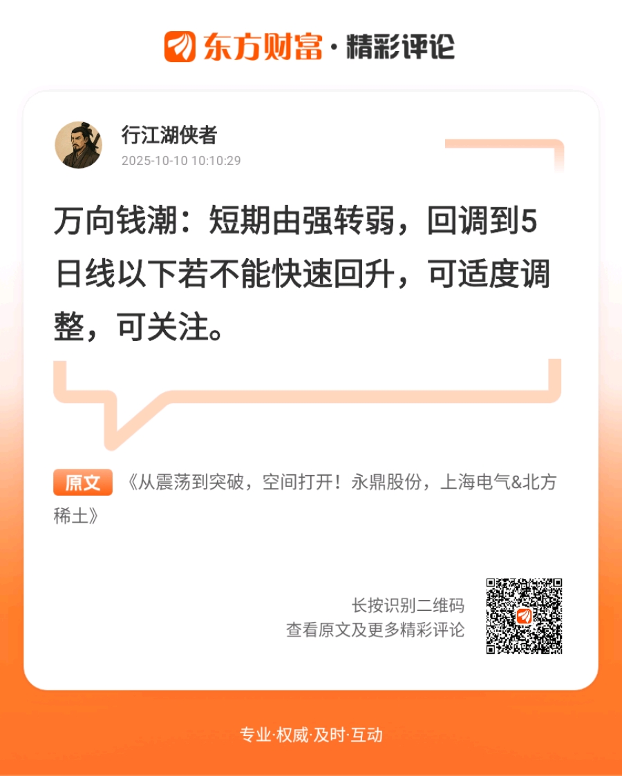 老师的提示很及时,方向一看就懂。//@行江湖侠者 :万向钱潮:短期由强转弱,回调到5日线以下若不能快速回升,可适度调整,可关注。