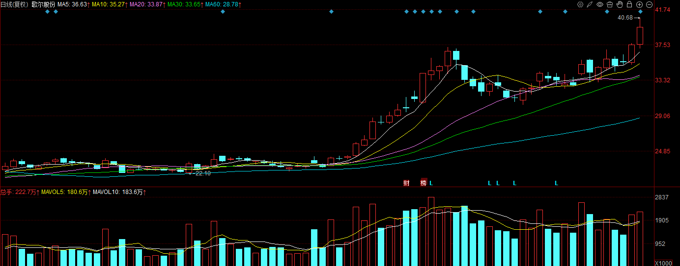 歌尔股份002241:该股目前已进入加速拉升阶段。继节前转强后,昨天股价再度新高,上升趋势稳固,强势特征鲜明。这完全贴合了前期的加速预期。今天有望延续这一上行节奏,继续向上突破空间。继续格局。