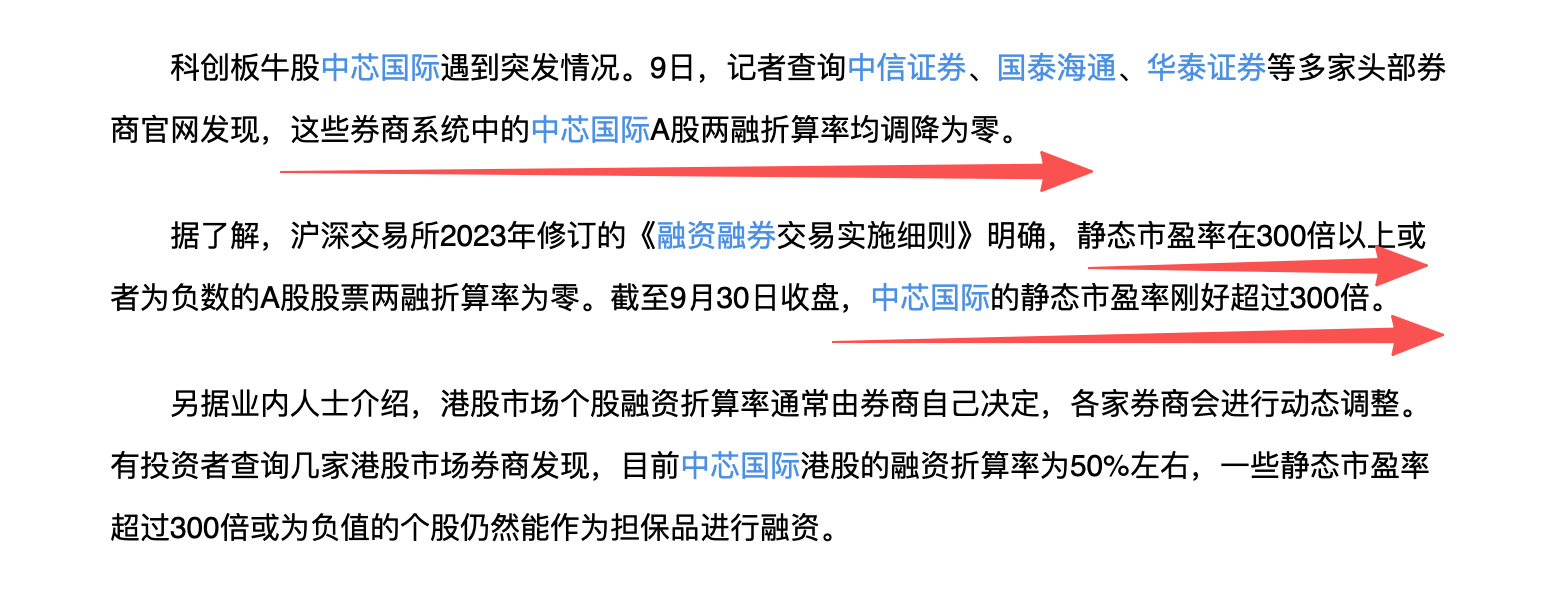 第一个利空:昨天国内的出现了一个重大的信号,昨天,中信证券调整了中芯国际的两融折算率,中信证券,国泰海通,华泰证券等几乎所有券商都把中芯国际的两融折算率调整为0.两融折算率调整为0,意味着投资者无法再用该股票作为抵押品进行融资买入或融券卖出,该股票暂时失去了作为融资融券担保品的资格。说直白一点,比如你持有100万市值的中芯国际,之前这个资产可以抵押加杠杆买其他股票的,但是现在不准这样做了。这是一个典型的阻止加杠杆的信号。类似中芯国际这种调整的还有,曼恩斯特、永鼎股份、哈空调、宏辉果蔬、天马科技、瑞晟智能、佰维存储等多只个股的两融折算率都在今日被调降为零。