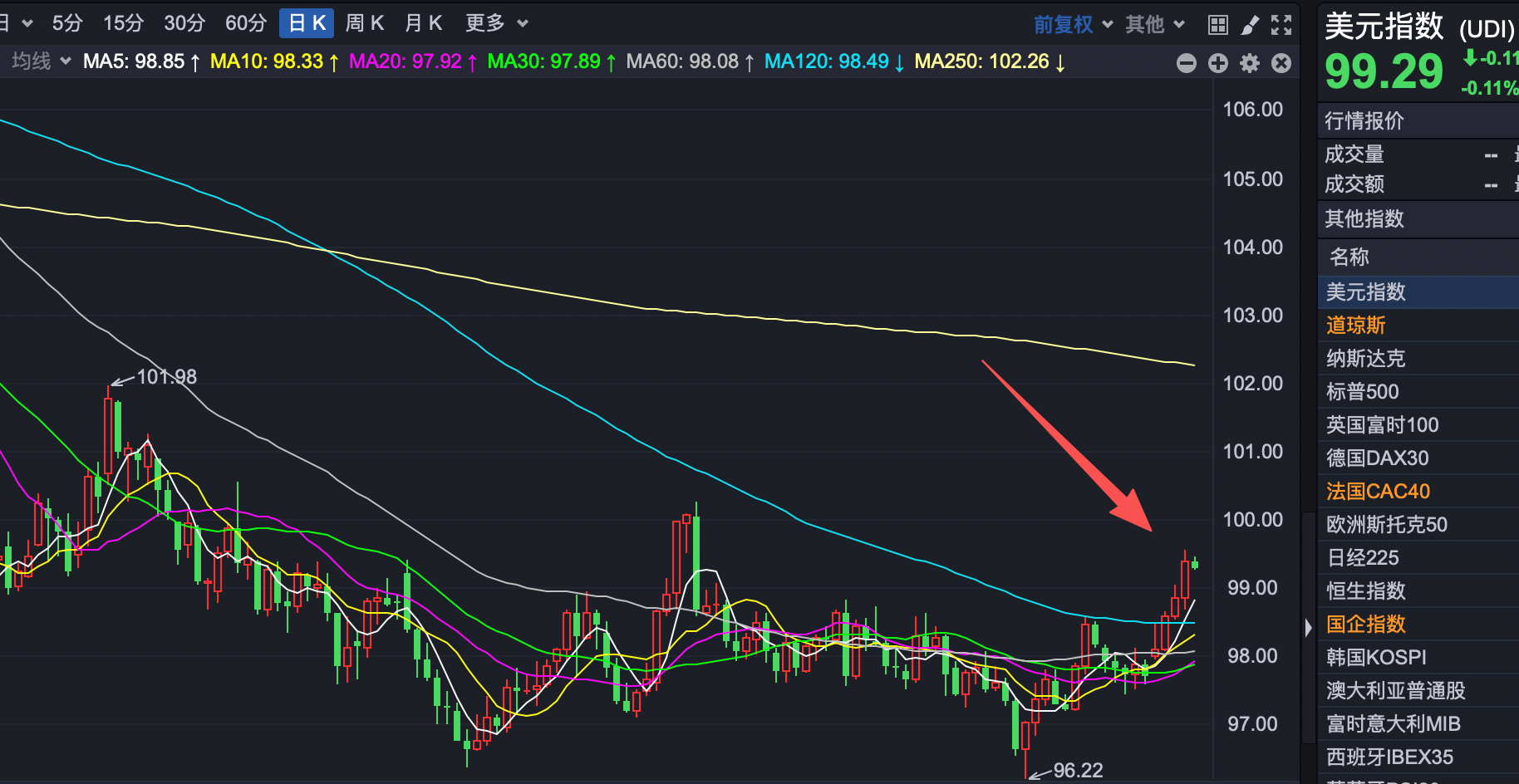 第二个利空;昨天我提示的,最近资产出现了一个奇怪现象,最近黄金走强,还有就是美元指数也在走强,下图是美元指数的日线图,走出了一个典型的见底反转的图形,美元指数走强,人民币汇率往往走弱,然后国际热钱会从A股港股市场流出,最近一段时间港股市场连续走弱,恒生指数都连跌5天了,这就是最重要的信息,接下来一段时间美元指数的走势大家一定要重视。