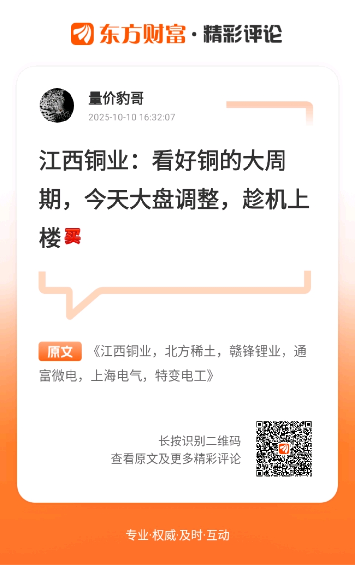 //@量价豹哥 :江西铜业:看好铜的大周期,今天大盘调整,趁机上楼