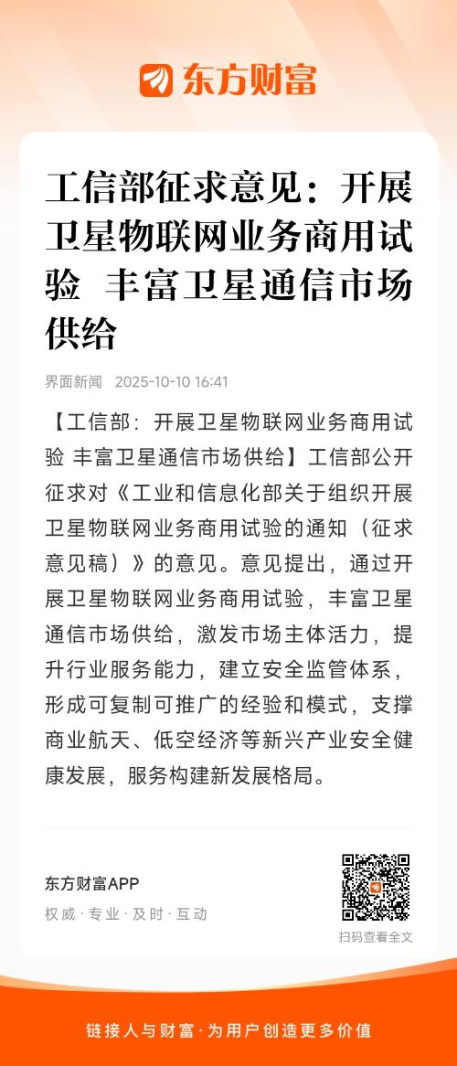 工信部公开征求对《工业和信息化部关于组织开展卫星物联网业务商用试验的通知(征求意见稿)》的意见。意见提出,通过开展卫星物联网业务商用试验,丰富卫星通信市场供给,激发市场主体活力,提升行业服务能力,建立安全监管体系,形成可复制可推广的经验和模式,支撑商业航天、低空经济等新兴产业安全健康发展,服务构建新发展格局。