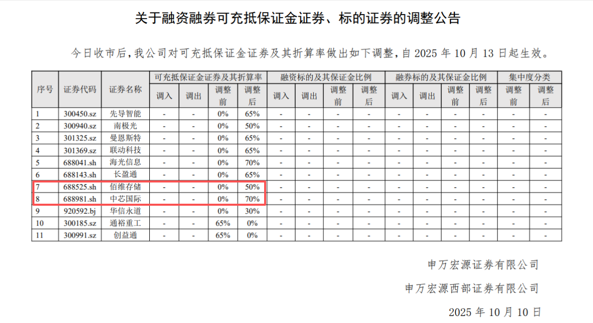根据申万宏源证券、申万宏源西部证券公告,今日收市后调整融资融券可充抵保证金证券及折算率,自10月13日起生效。其中,先导智能、南极光、曼恩斯特、联动科技、海光信息、长盈通、佰维存储、中芯国际、华信永道等的可充抵保证金证券折算率由0%上调至30%-70%不等,就在10月9日,佰维存储、中芯国际等在上一交易日被多家券商将折算率调为零。而通裕重工、创益通两股的折算率则由65%下调至0%。根据交易所规定,个股静态市盈率如果超过300倍,或者负数的情况下,融资融券折算率就会被调为零。