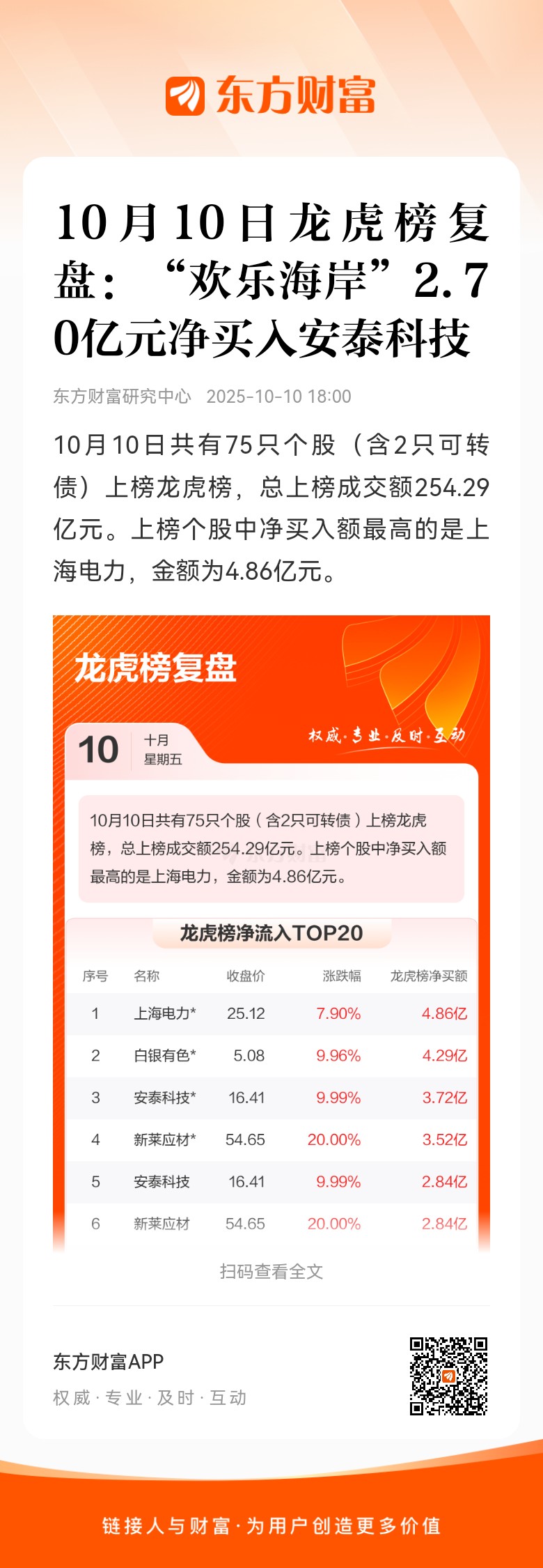 10月10日共有75只个股(含2只可转债)上榜龙虎榜,总上榜成交额254.29亿元。上榜个股中净买入额最高的是上海电力,金额为4.86亿元。