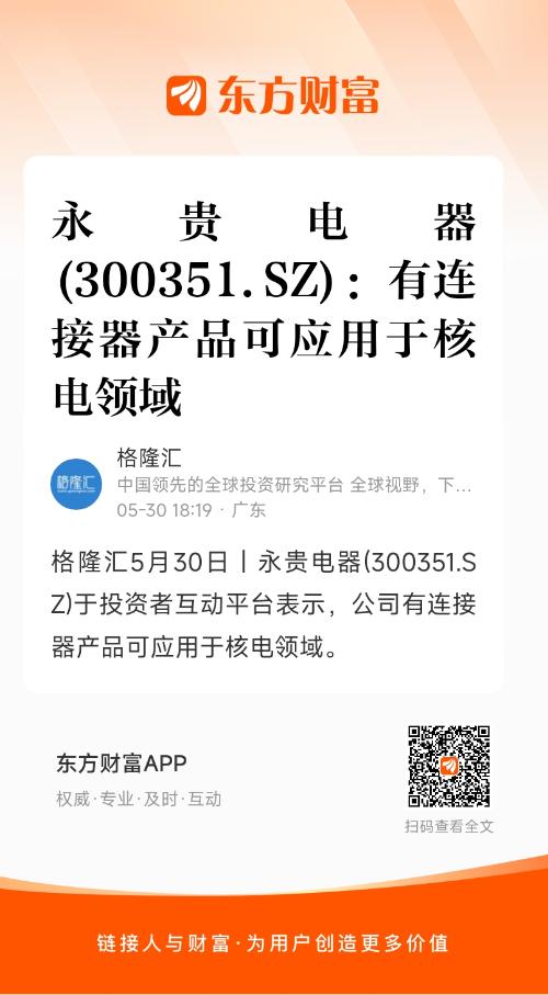 格隆汇5月30日丨永贵电器(300351.SZ)于投资者互动平台表示,公司有连接器产品可应用于核电领域。