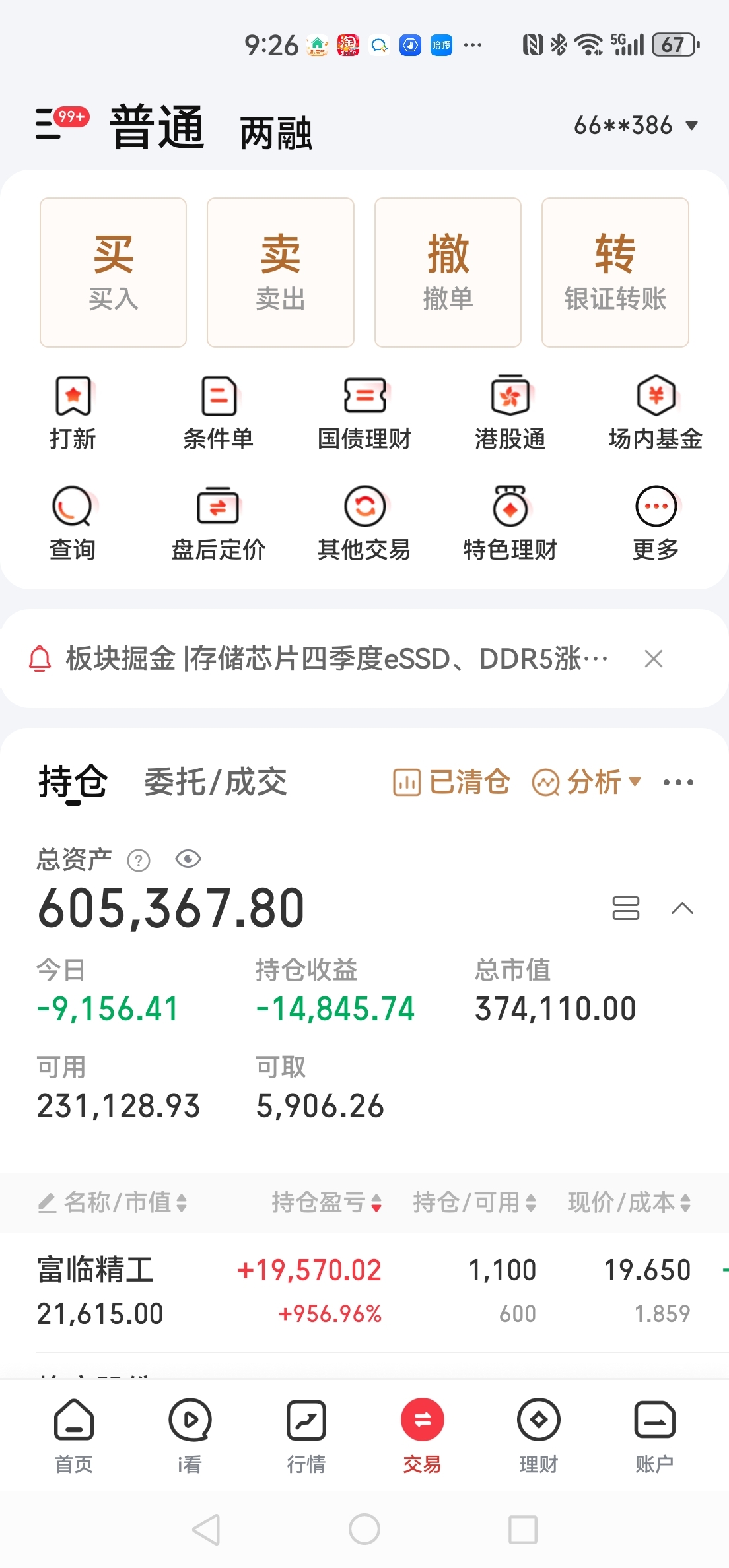 10月10号,真留恋昨天啊,都是新高,今天的大调整如期而至,我也没有逃过命运的安排,现在想想昨天减仓减的还太少,今天跌的都是权重大票,小票和已结的一些垃圾票都在涨,。今天跌了1.5%,主要是芯片电池能源都在大回调,明天应该能修复吧,今天回补了一些富临精工,还有开了一个网宿科技,别的都没有操作了,看我跌得这么惨,给大家提供一下情绪价值吧!
