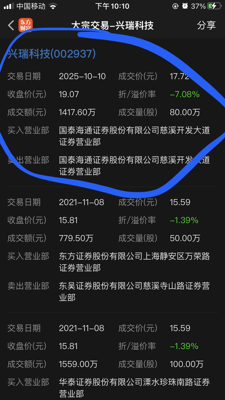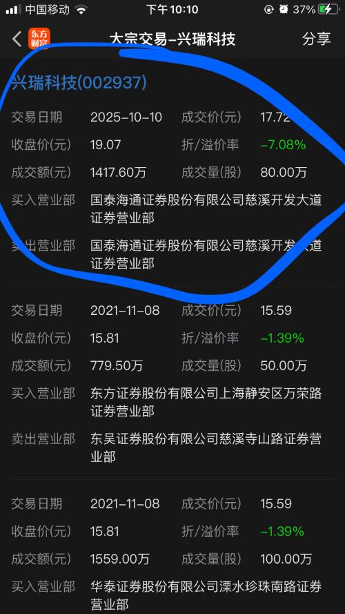 2025年10月10日,兴瑞科技发生了1笔大宗交易,总成交80万股,成交金额1417.6万元,成交价17.72元。当日收盘报价19.07元,跌幅3.10%,成交金额1.31亿元;大宗交易成交金额占当日成交金额10.84%,折价7.08%。