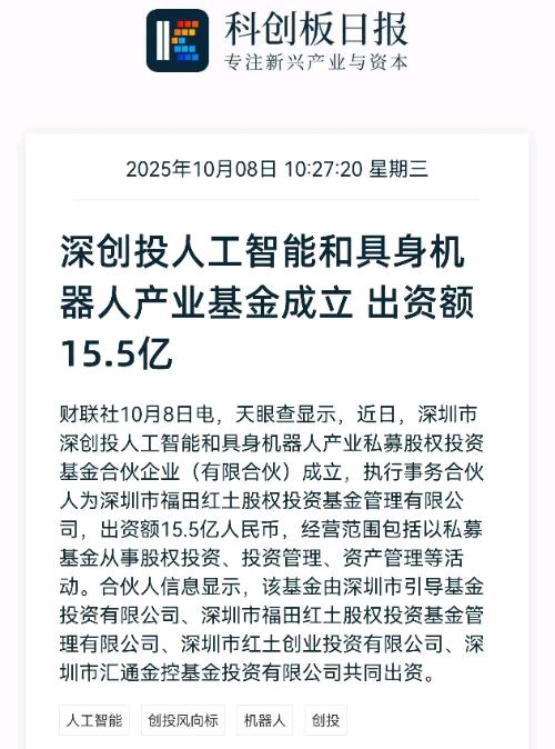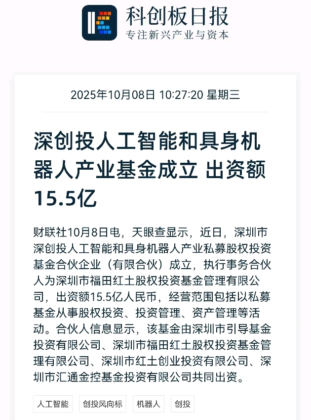 15.5亿元基金设立!投向人工智能和具身机器人产业 深创投近期正式成立一只规模达15.5亿元的人工智能和具身机器人产业私募股权基金,此次设立基金由深圳市引导基金、深创投红土等机构共同出资,延续了深圳“政府引导+市场化运作”的高效模式。深圳在人工智能和机器人领域已形成强大的产业集群优势。数据显示,2024年深圳AI产业规模达到3685亿元,机器人产业链总产值突破2000亿元,聚集了2600余家人工智能企业和34家机器人上市企业。这些企业构成了以华为、腾讯为龙头,比亚迪、大疆为支撑,优必选、云天励飞等创新企业为中坚的“雁阵梯队”。例如,优必选的科研级机器人“天工行者”已获百台意向订单;乐聚机器人推出了全球首款5G-A人形机器人“夸父”;越疆的仿生六足机器人在复杂地形中表现出色。这些创新企业覆盖了从硬件、零部件到算法的关键环节,体现了深圳完整的产业链竞争力。多层次基金体系支撑产业发展,深创投此次设立的15.5亿元基金是深圳系统化基金布局的一部分。截至目前,深创投在人形机器人领域已累计投资项目约40个,涵盖从核心零部件到整机厂商的全产业链。深圳通过明确的政策目标为产业发展指引方向。《深圳市加快打造人工智能先锋城市行动计划(2025—2026年)》提出,到2026年,全市人工智能企业数量将超过3000家,独角兽企业超过10家,并推动百款以上AI终端进入市场,打造万亿元级AI终端产业。发现独角兽始终致力于资本与创新的结合,持续推动人工智能技术从实验室走向生产线