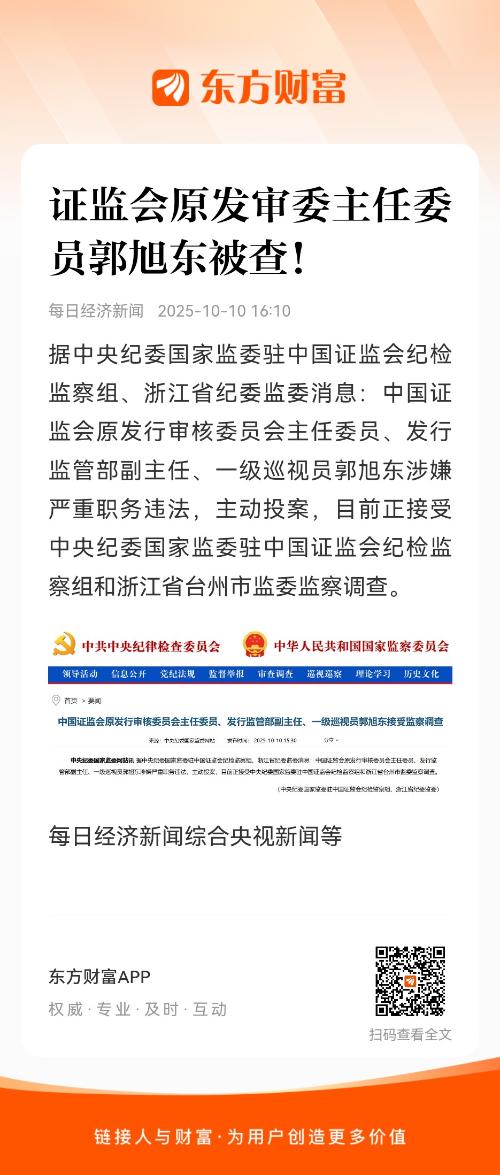 据中央纪委国家监委驻中国证监会纪检监察组、浙江省纪委监委消息:中国证监会原发行审核委员会主任委员、发行监管部副主任、一级巡视员郭旭东涉嫌严重职务违法,主动投案,目前正接受中央纪委国家监委驻中国证监会纪检监察组和浙江省台州市监委监察调查。