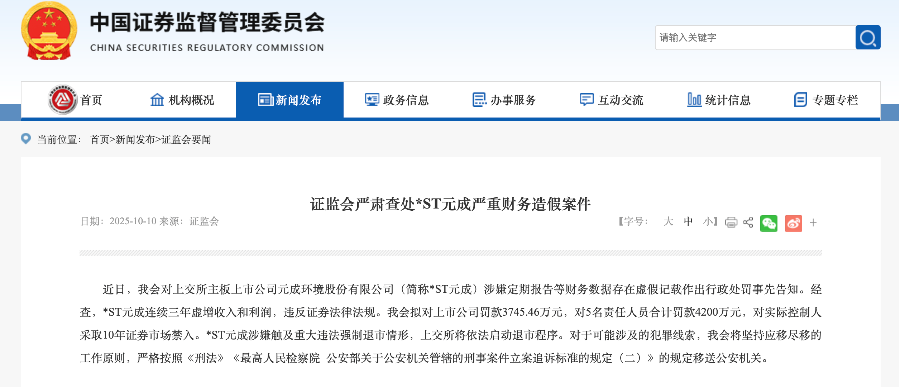 2025年10月10日,证监会正式对*ST元成(元成环境股份有限公司)作出行政处罚事先告知,揭开这家公司连续三年系统性财务造假的黑幕。