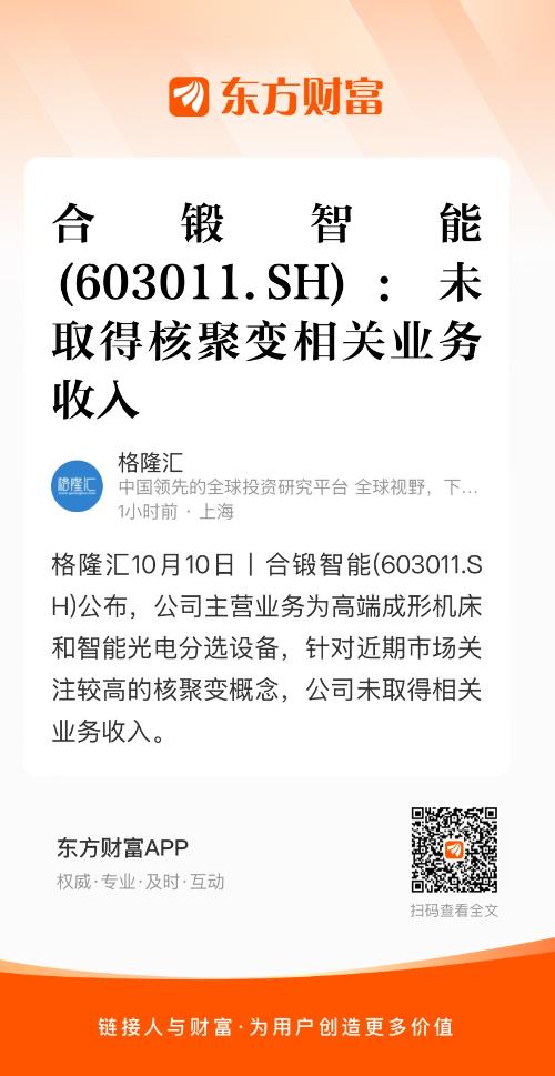 格隆汇10月10日丨合锻智能(603011.SH)公布,公司主营业务为高端成形机床和智能光电分选设备,针对近期市场关注较高的核聚变概念,公司未取得相关业务收入。