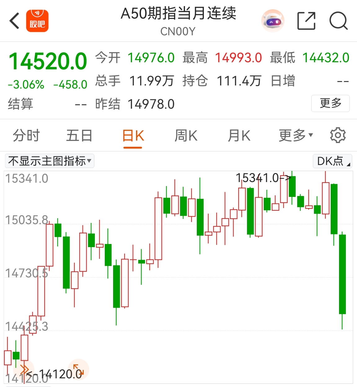 富时A50期指的阶段理论调整目标区域“价值中枢”位于14452.66点,“波动下沿”位于14403.00点。