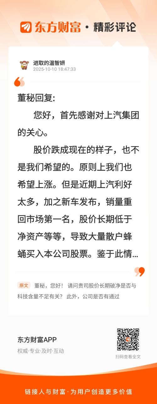 董秘回复: 您好,首先感谢对上汽集团的关心。 股价跌成现在的样子,也不是我们希望的。原则上我们也希望上涨。但是近期上汽利好太多,加之新车发布,销量重回市场第一名,股价长期低于净资产等等,导致大量散户蜂蛹买入本公司股票。鉴于此情况,我们只能被动的调整了操盘策略,把原计划的上涨及时调整为下杀,因为只有这样才能收割散户,毕竟散户都肥得流油啊! 虽然如此,我们还是要再次承诺,等散户们都割肉离场之时,也就是里面没几个散户了,我们到时一定会维护股价拉升,让股价回归正常价格! 再次感谢对上汽集团的关注! 祝周末愉快! 我在《董秘,您好! 请问贵司股价长期破净是否与科技含量不足有关? 此外,公司是否有通过》的评论获得了大家的关注。