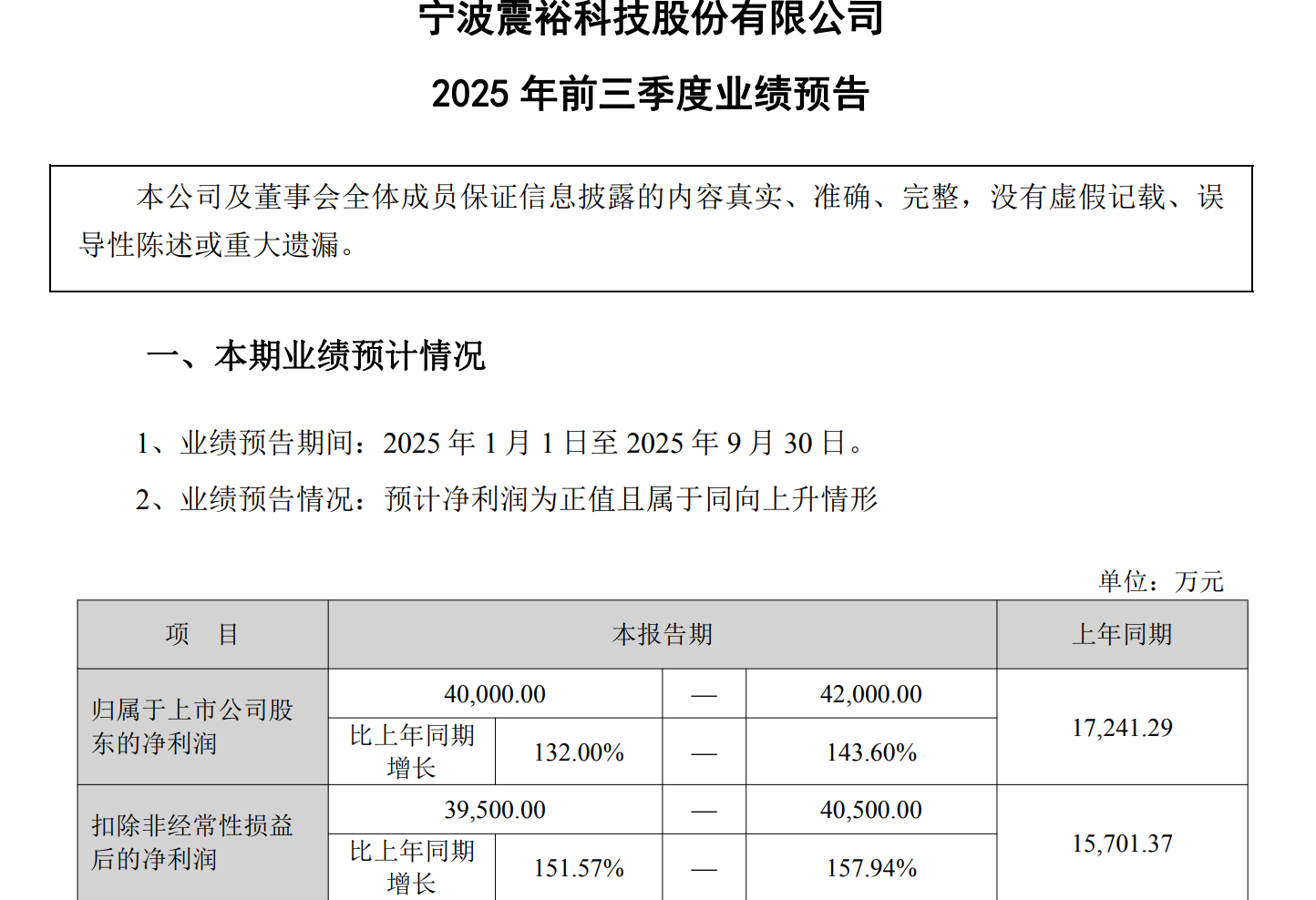 震裕科技,利润增长132%到144%,利润达到4亿到4.2亿;