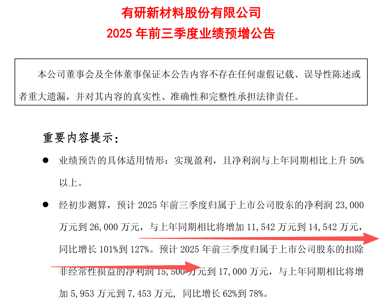 有研新材,利润增长101%到127%,利润达到2.3亿到2.6亿;$有研新材(SH600206)$