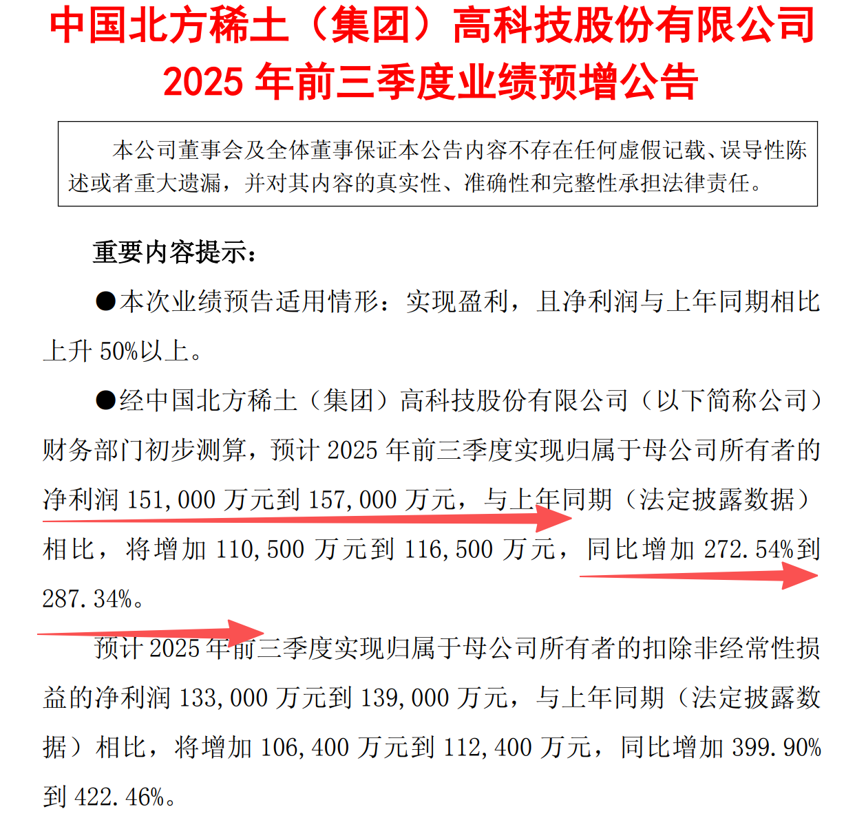 北方稀土,利润增长273%到287%,利润达到15到15.7亿;$北方稀土(SH600111)$