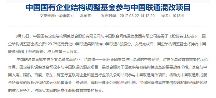 回顾重磅消息:中国联通2017年混改股价为6.83元/股为此次股东拟减持的成本价