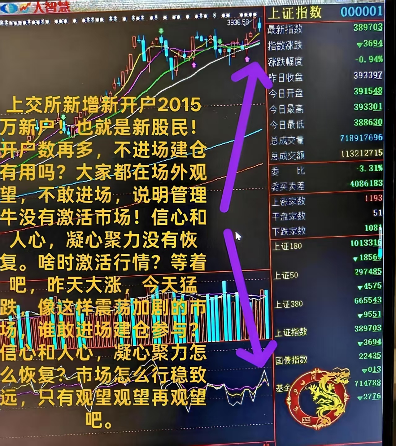 上交所新增新开户2015万新户!也就是新股民!开户数再多,不进场建仓有用吗?大家都在场外观望,不敢进场,说明管理牛没有激活市场!信心和人心,凝心聚力没有恢复。啥时激活行情?等着吧,昨天大涨,今天猛跌,像这样震荡加剧的市场,谁敢进场建仓参与?信心和人心,凝心聚力怎么恢复?市场怎么行稳致远,只有观望观望再观望吧。