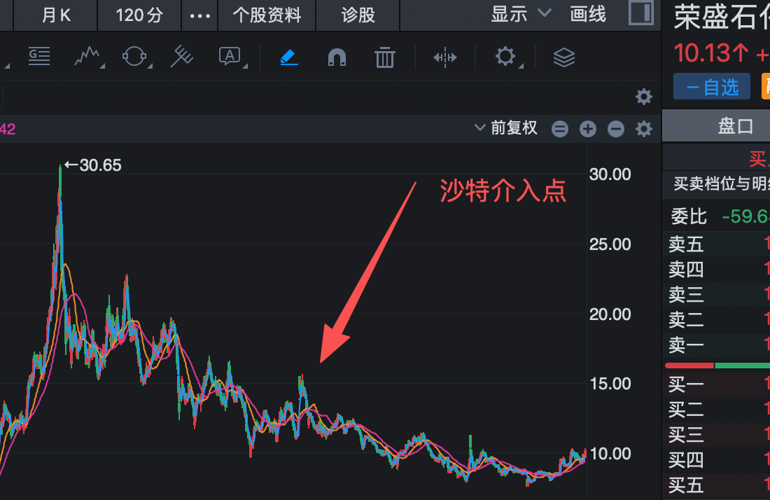 沙特在A股唯一重仓了一个股票,当年买进的时候沙特用了246亿元,直接收购了公司10%的股权,不过这个股票沙特介入后股价一直暴跌,这个股票从高点30元最低一路跌到7元附近,股价暴跌70%,而沙特是在股价跌了一半之后,也就是15元左右介入的,没想到,现在也亏这么惨。