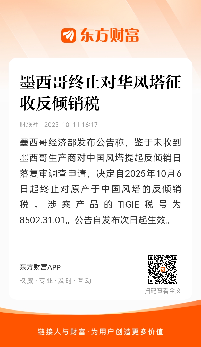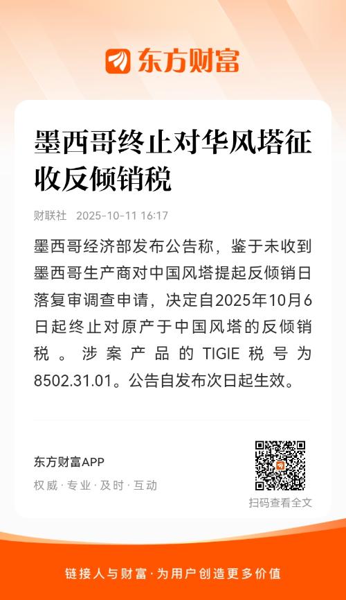 墨西哥经济部发布公告称,鉴于未收到墨西哥生产商对中国风塔提起反倾销日落复审调查申请,决定自2025年10月6日起终止对原产于中国风塔的反倾销税。涉案产品的TIGIE税号为8502.31.01。公告自发布次日起生效。