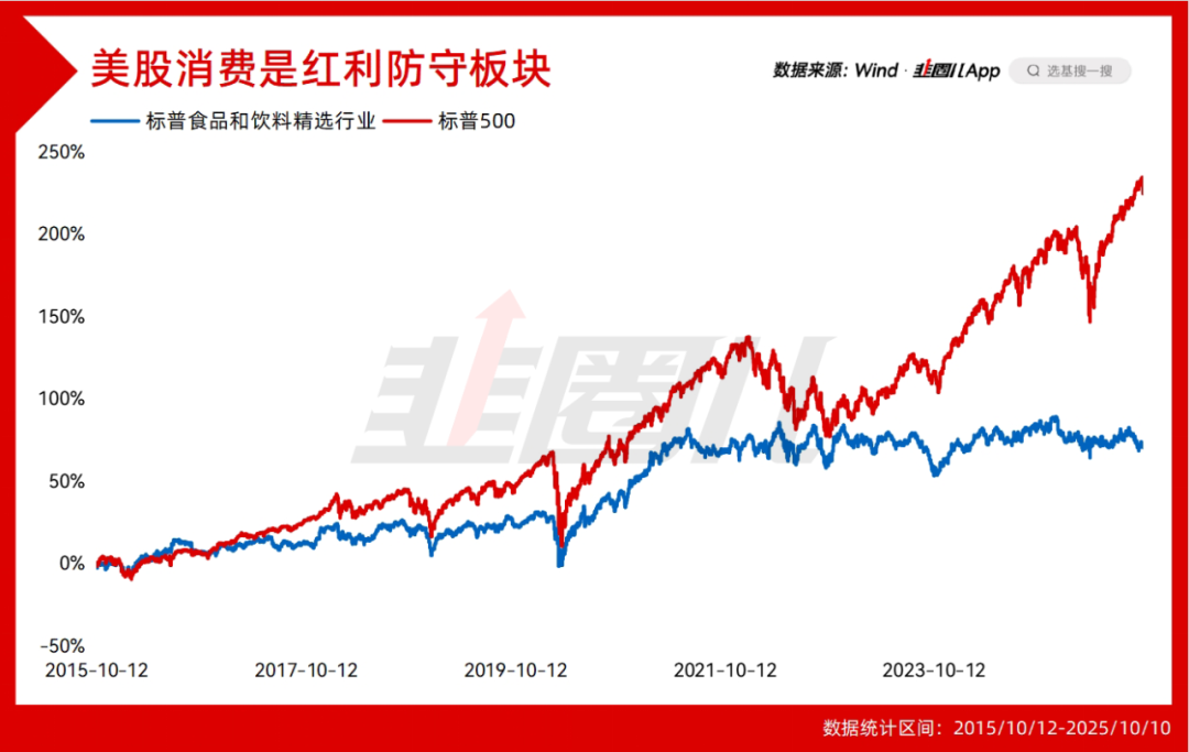 这个全收益指数近10年涨幅在1倍左右,价格指数大约70%,2021年之后美国高通胀,标普食品饮料指数基本没涨,属于成长性不够,只能在科技股涨麻了之后用来兜个底,差不多就是红利的意思。