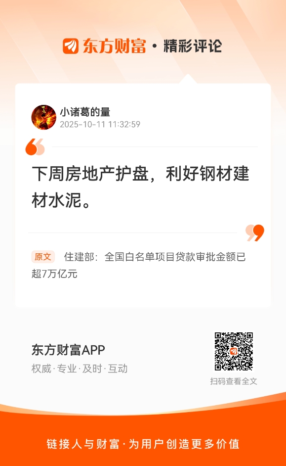 下周房地产护盘,利好钢材建材水泥。 我在《住建部:全国白名单项目贷款审批金额已超7万亿元》的评论获得了大家的关注。