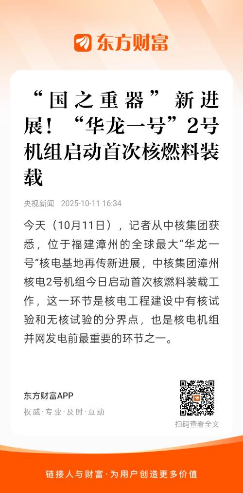 今天(10月11日),记者从中核集团获悉,位于福建漳州的全球最大“华龙一号”核电基地再传新进展,中核集团漳州核电2号机组今日启动首次核燃料装载工作,这一环节是核电工程建设中有核试验和无核试验的分界点,也是核电机组并网发电前最重要的环节之一。