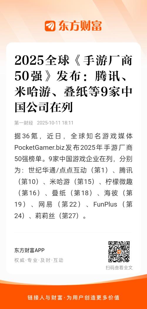 据36氪,近日,全球知名游戏媒体PocketGamer.biz发布2025年手游厂商50强榜单。9家中国游戏企业在列,分别为:世纪华通/点点互动(第1)、腾讯(第10)、米哈游(第15)、柠檬微趣(第16)、叠纸(第18)、海彼(第19)、网易(第22)、FunPlus(第24)、莉莉丝(第27)。