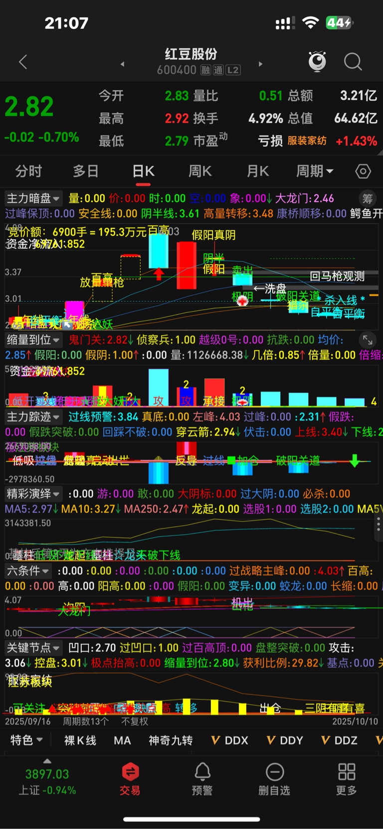 小豆豆,百日高量遇阻后次日回马枪反包涨停板,次日假阳真阴务必当心,后面共派出四个侦察兵试探(9月25和29日,10月9日和10日,目前板后已六阴来财跌幅近 30%,破阳关道,下周一看会不会以七阴打到2.7即黄金线下线附近,守住关键支撑位 2.65,可以再度建仓买入