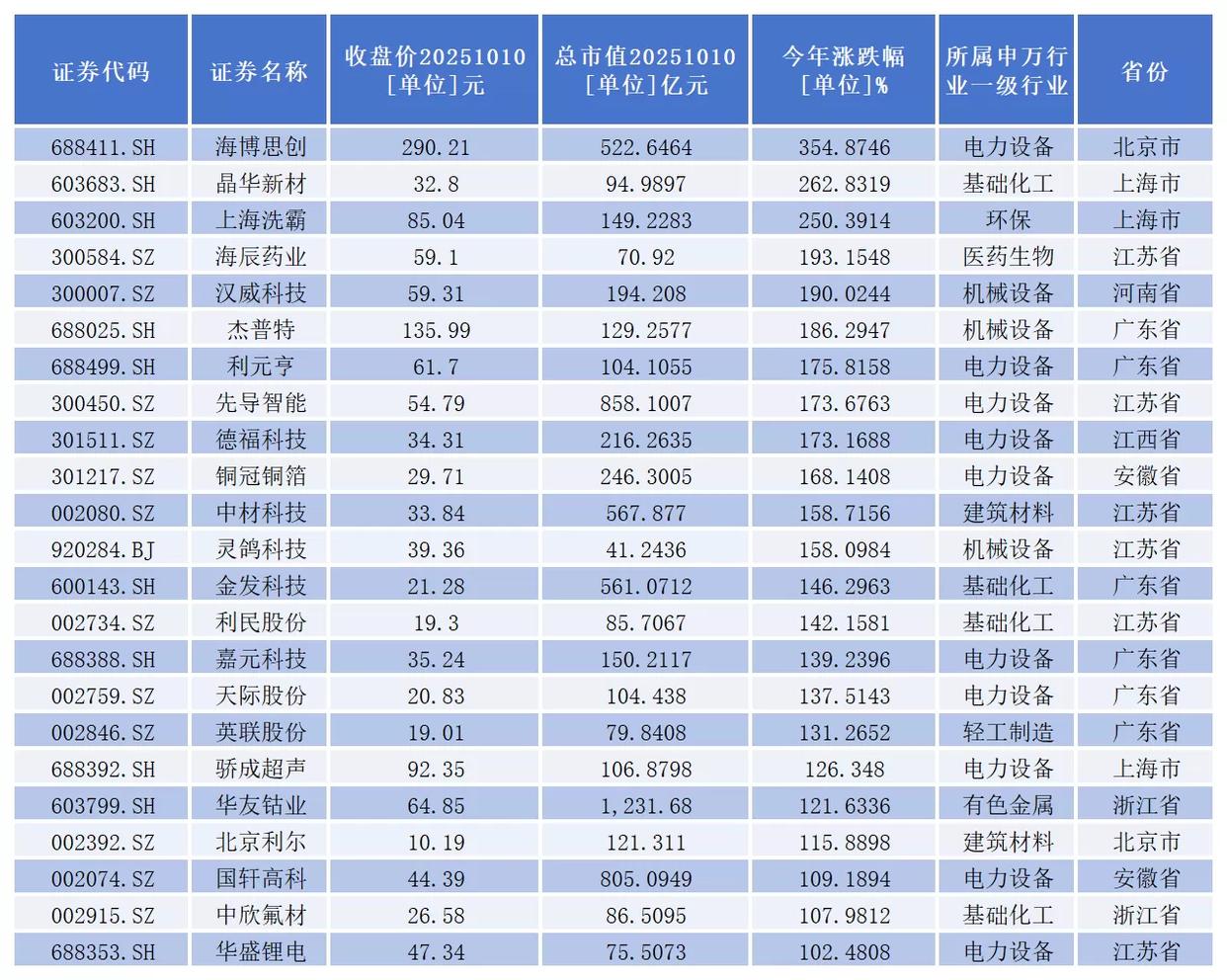 其中,23家上市公司股价成功实现翻倍,海博思创(688411.SH)、晶华新材(603683.SH)、上海洗霸(603200.SH)位居前三,年内股价涨幅均超过200%。