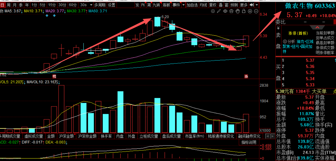 傲农生物:(603363)是猪肉板块里辨识度最高的票,公司业绩实现扭亏,公司生猪销量及毛利率都在增长,司战略聚焦江西、福建两大核心区域,打造区域龙头,形成"饲料+养猪+食品"一体化产业链,还有很大上涨潜力,有望走二波。