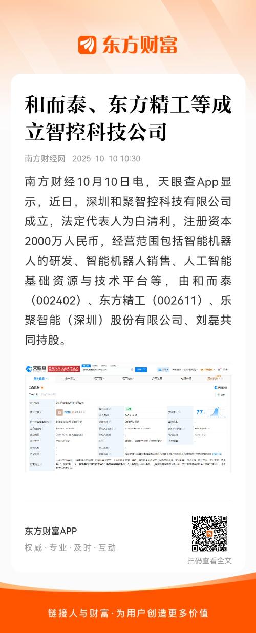 南方财经10月10日电,天眼查App显示,近日,深圳和聚智控科技有限公司成立,法定代表人为白清利,注册资本2000万人民币,经营范围包括智能机器人的研发、智能机器人销售、人工智能基础资源与技术平台等,由和而泰(002402)、东方精工(002611)、乐聚智能(深圳)股份有限公司、刘磊共同持股。