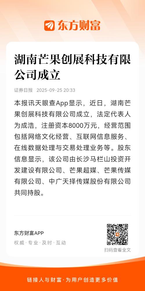本报讯天眼查App显示,近日,湖南芒果创展科技有限公司成立,法定代表人为成浩,注册资本8000万元,经营范围包括网络文化经营、互联网信息服务、在线数据处理与交易处理业务等。股东信息显示,该公司由长沙马栏山投资开发建设有限公司、芒果超媒、芒果传媒有限公司、中广天择传媒股份有限公司共同持股。