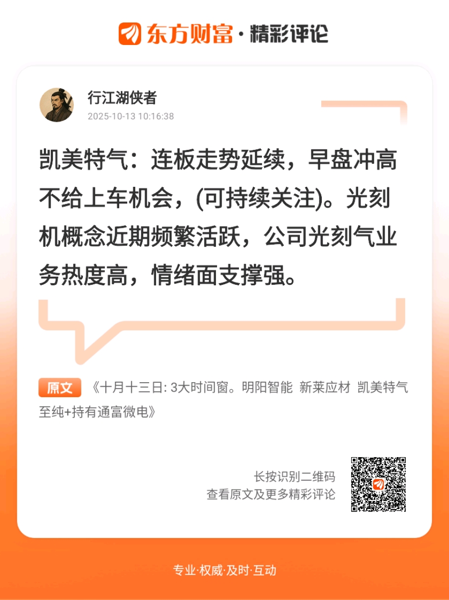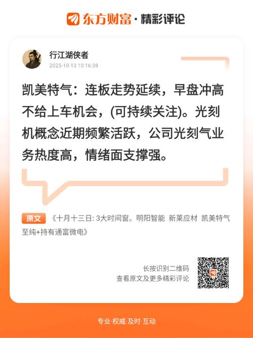 侬讲得好有道理,学到啲东西咯。//@行江湖侠者 :凯美特气:连板走势延续,早盘冲高不给上车机会,(可持续关注)。光刻机概念近期频繁活跃,公司光刻气业务热度高,情绪面支撑强。
