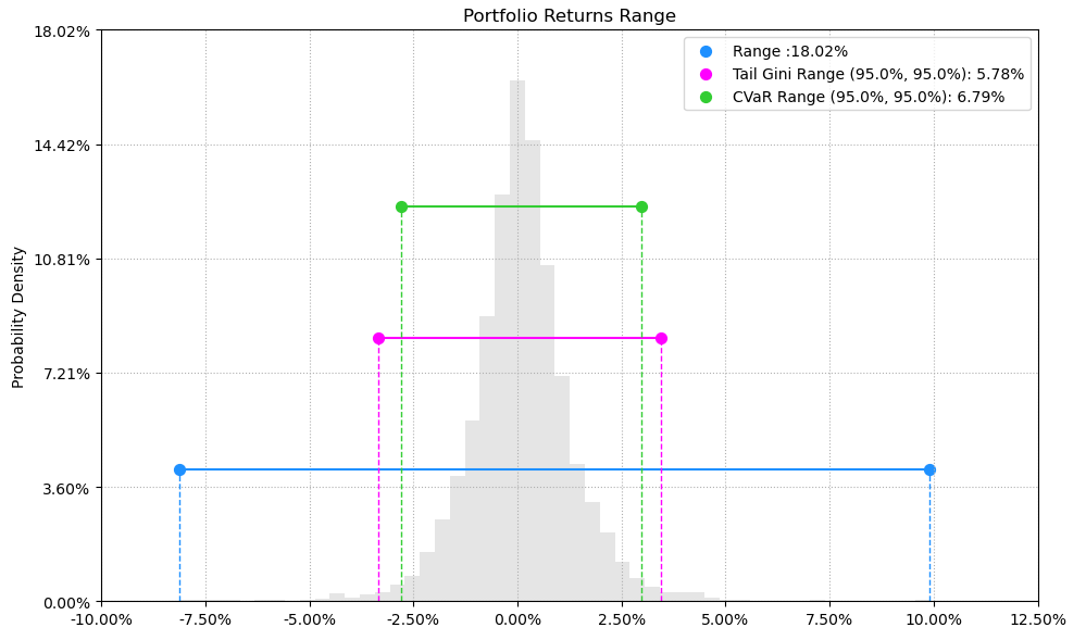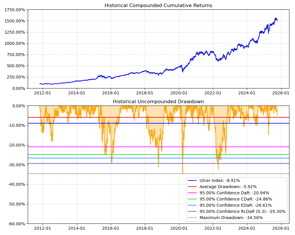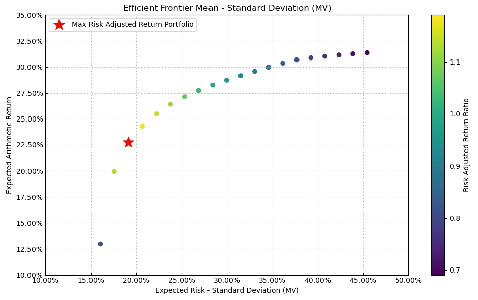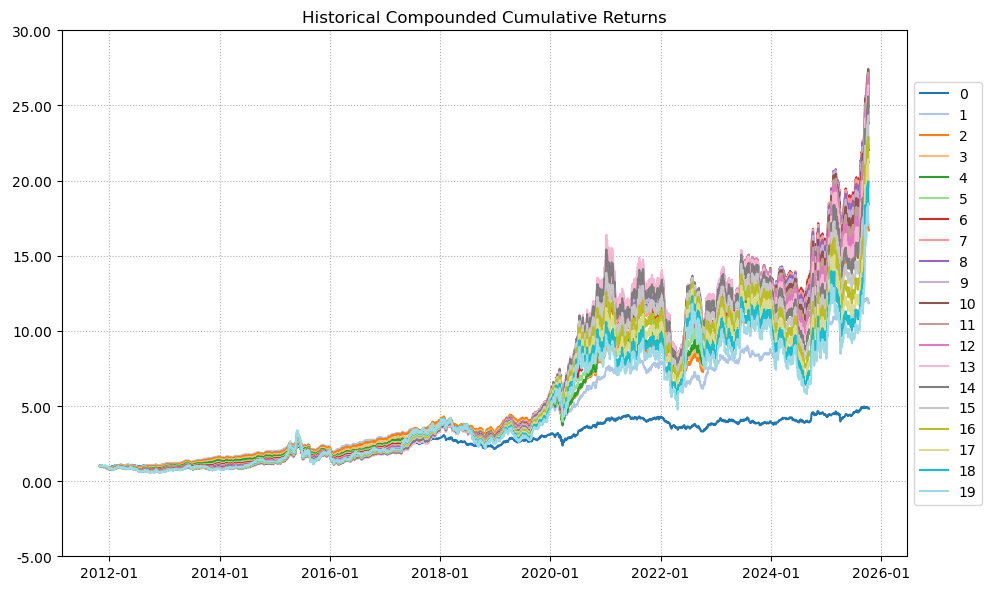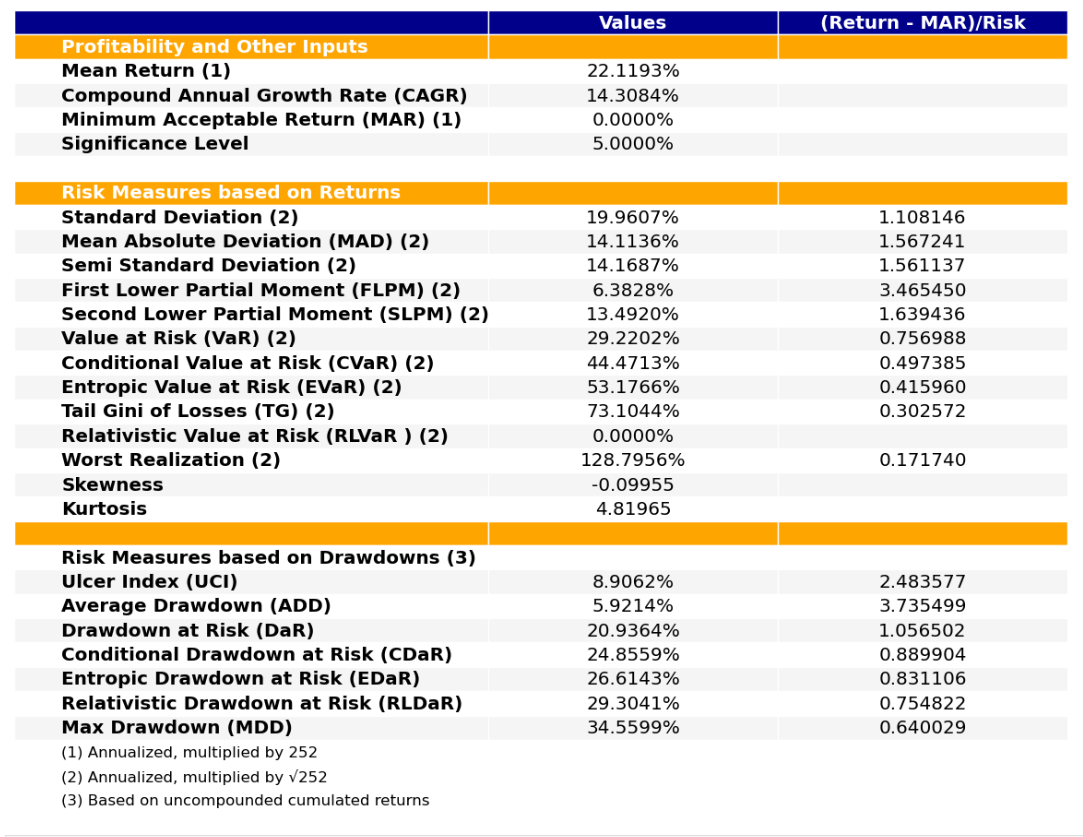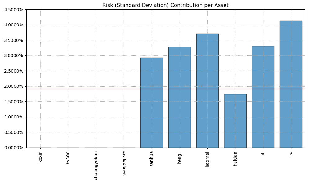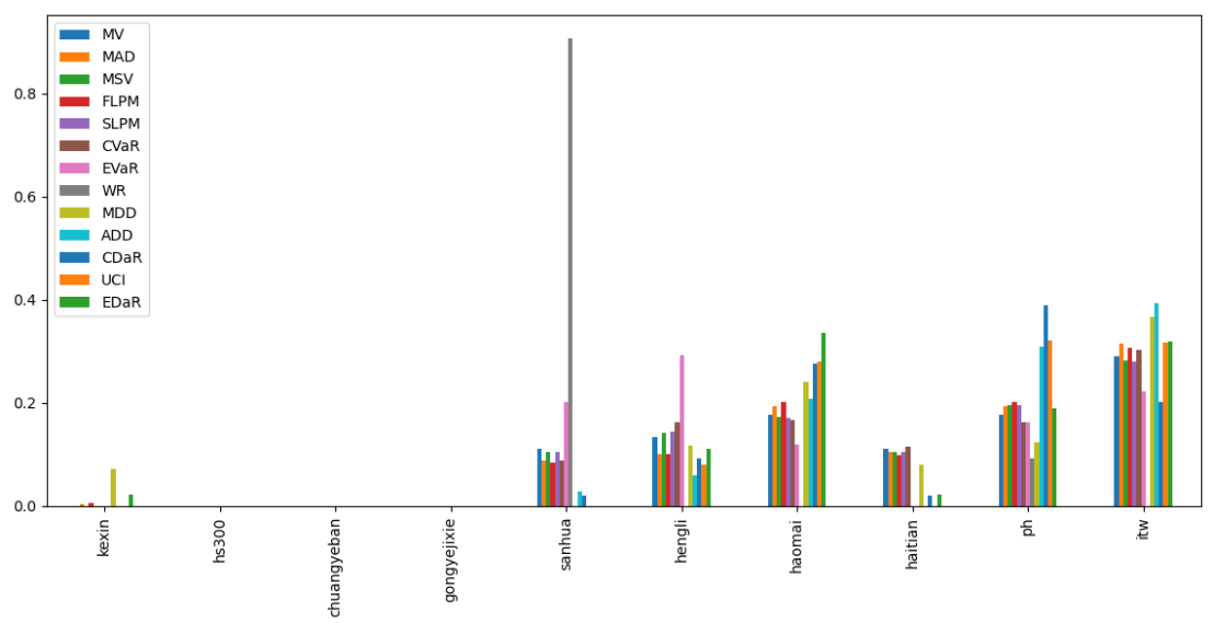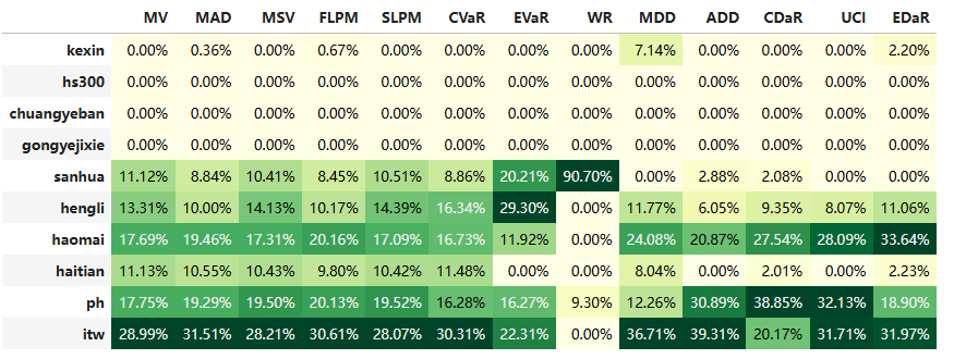 最后看下整个投资组合的情况,日度均值回报在0.09%,比上次测的重型设备行业高20%,而且6.79%的CVaR波动反而还更小就很惊艳。(注:均值回报看Mean那一栏,越高越好;CVaR波动看CVaR那一栏,越低越好)