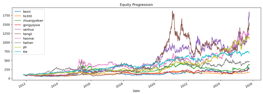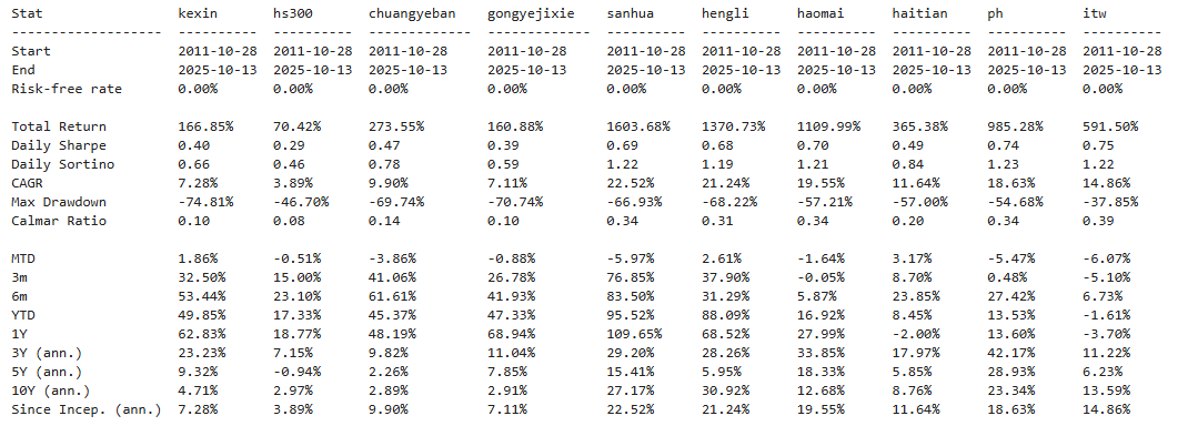 区间累计回报近18倍,最大回撤34.56%,投资组合的整体表现要好于科新机电个股。整个工业机械行业盈利能力优秀,波动低位,夏普比率1.19实属优秀。(注:累计回报看Cumulative Returns那一栏,越高越好;最大回撤看Maximum Drawdown那一栏,越低越好)
