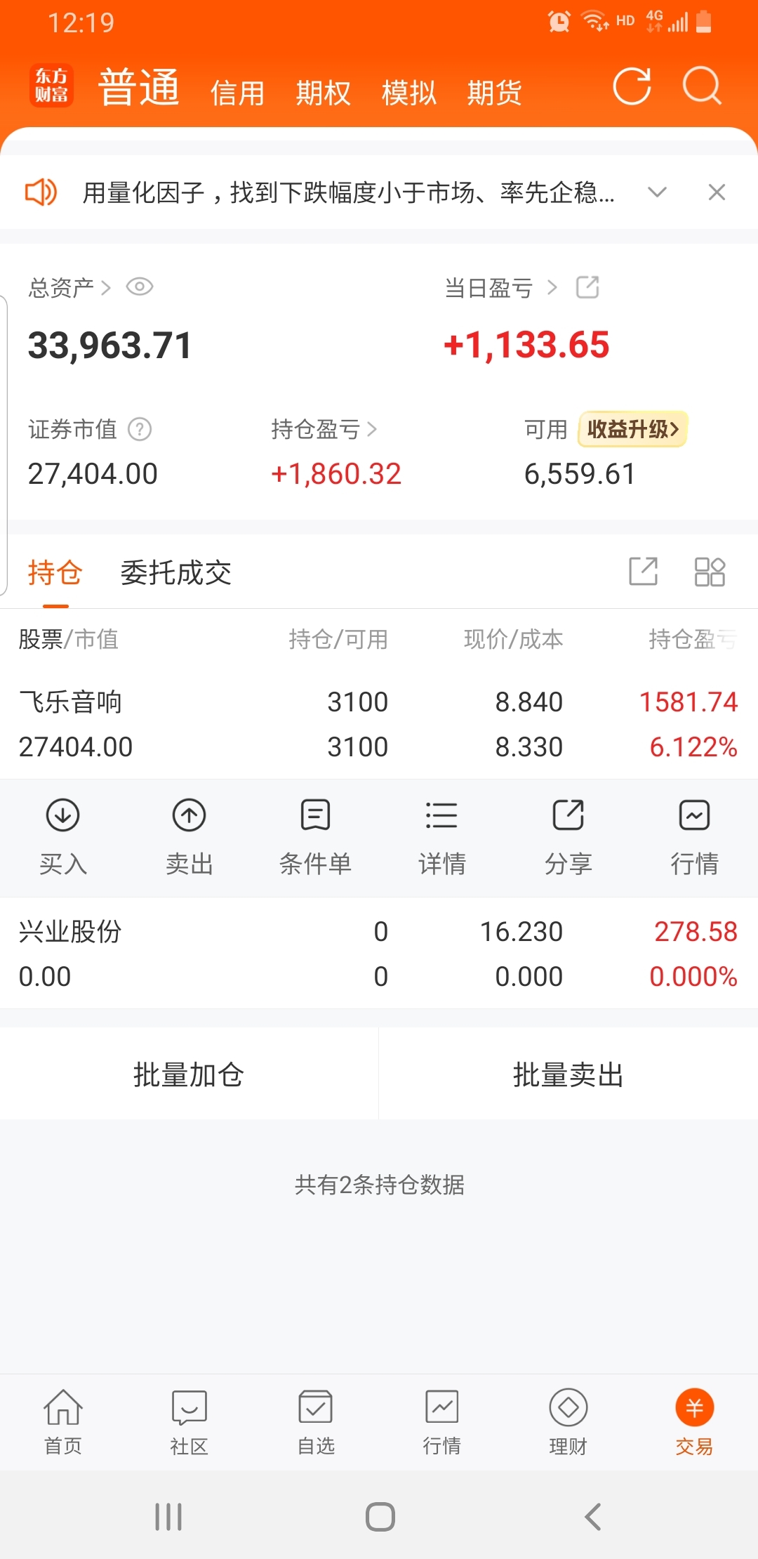 依旧稀里糊涂不知道多少天看来我这种懒人不适合更新这 反正最近每天都红 飞乐上周四抄底进来接着俩天上涨七个多点回落到俩三个点 为啥没动呢因为我没找到更好的 今天一会打算出掉 不是不看好 明天大概率还是上涨 我出是为了给朋友凑个首付买个车打算今天出掉 要不我会明天看情况在做打算 而且今天想起来更新也是明天用钱呀今天清仓做个短暂告别 过几天收回来钱在接着玩儿