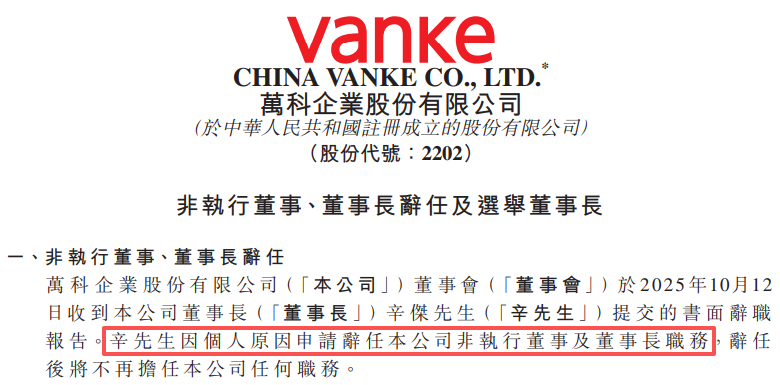 10月13日早间,万科在深港两地交易所同时公告,公司董事会于2025年10月12日收到公司董事长辛杰提交的书面辞职报告。因个人原因,辛杰申请辞去公司董事、董事长职务,辞职后将不再担任公司任何职务。辛杰的辞职报告自送达公司董事会之日起生效。