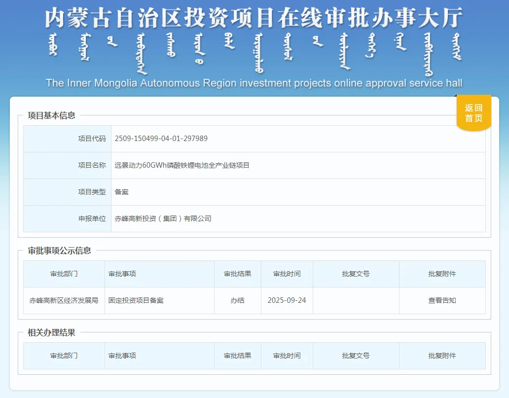本网讯  近日,内蒙古自治区投资项目在线审批办事大厅显示,由赤峰高新投资(集团)有限公司申报的“远景动力60GWh磷酸铁锂电池全产业链项目”完成备案。