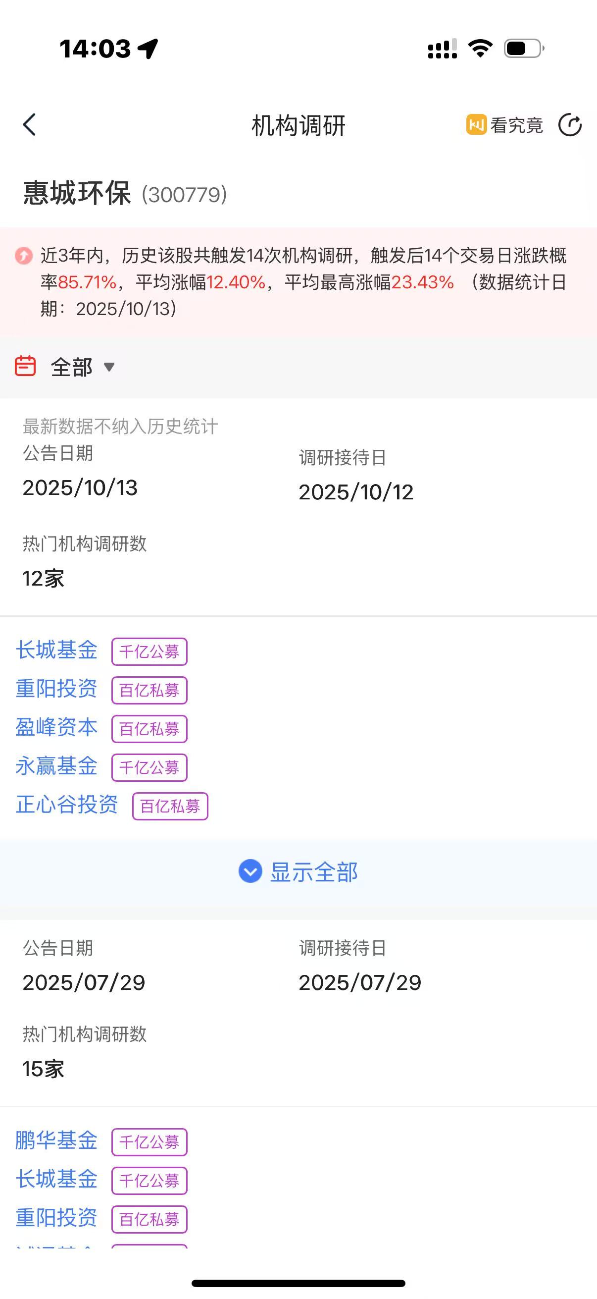 惠城环保12号接受了长城基金、重阳资本等机构调研,这票数据显示接受调研后14个交