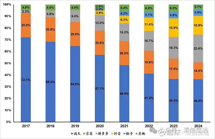 2017-2022年,淘宝市占率从72.1%逐年下降至41.2%;2023年、2024年进一步下降至36.5%、36.4%。拼多多和抖音的市占率均逐年上升,成为主流电商的重要组成部分。快手呈现先上升,后稳定的趋势,2024年占据市场5.9%左右。