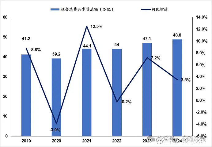 如图所示,2019-2024年社会消费品零售同比增速、实物商品网络零售同比增速呈现放缓的迹象。社会消费品零售总额同比增速从2019年的8.0%下降至2024年的3.5%。实物商品网络零售额同比增速从2019年的20.7%下降至2024年的6.5%。