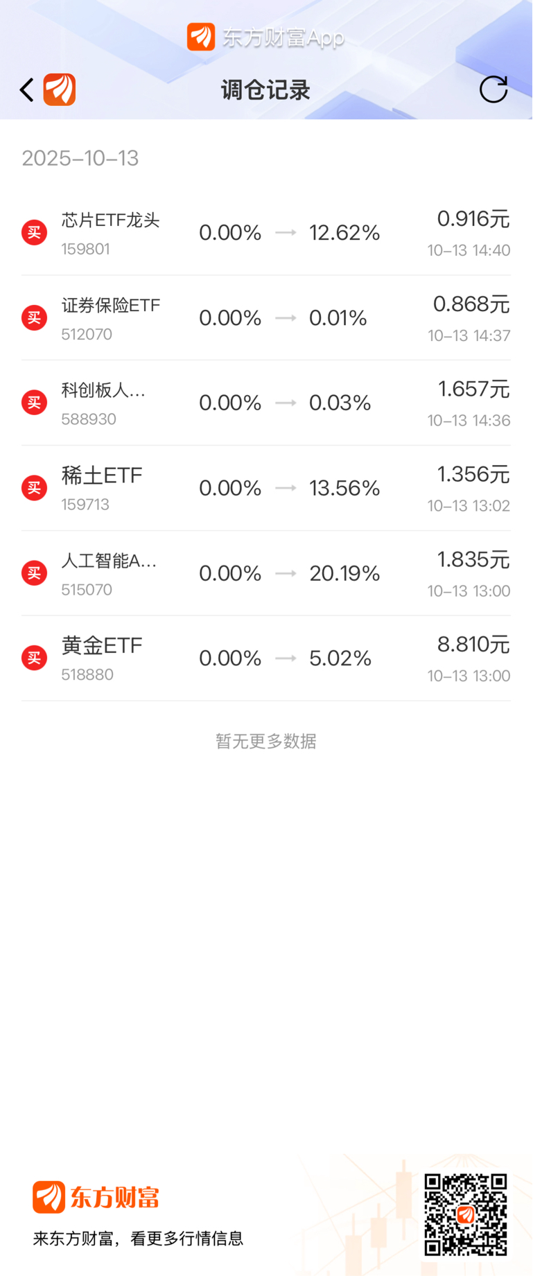 今日复盘10.13:开赛第一天,从收益来看不算高,0.95%。今天黄金ETF还是
