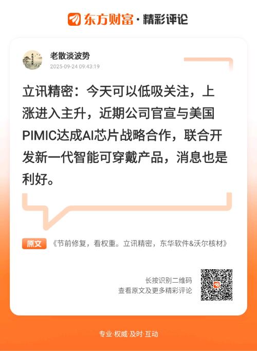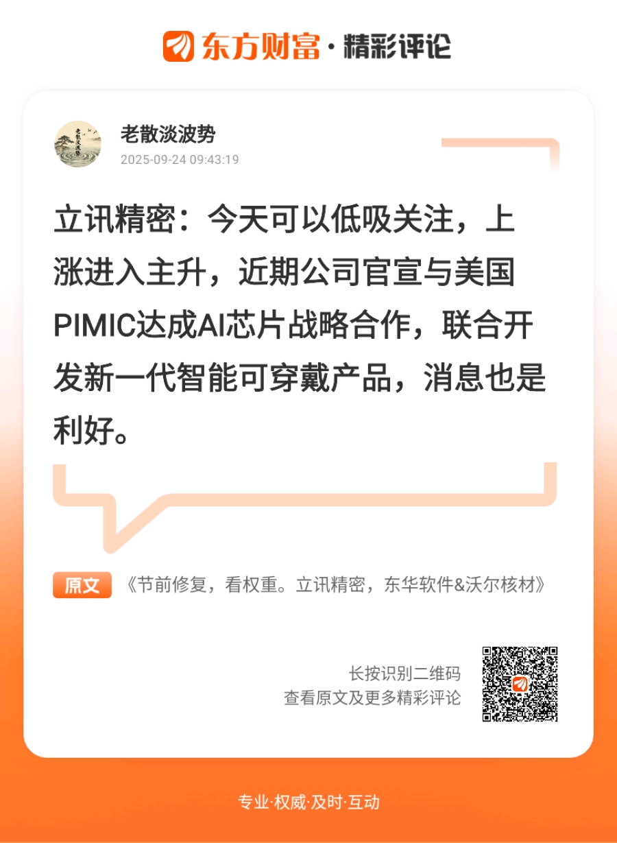 近期公司(官宣与美国PIMIC达成AI芯片战略合作),(联合开发新一代智能可穿戴产品),消息(利好)。同时国内(AI+消费电子产业政策加码),中长线同样(利好),(早盘密切关注)。