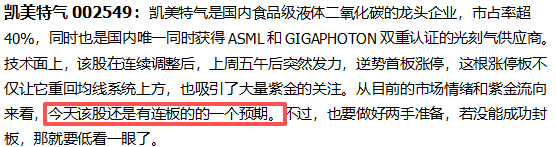 凯美特气002549:凯美特气是国内食品级液体二氧化碳的龙头企业,市占率超40%,同时也是国内唯一同时获得ASML和GIGAPHOTON双重认证的光刻气供应商。该股今天也是如期的连板成功。早盘时就说了,若是没有封成功封板,那就要低看一眼。现在它也是如期的连板成功了,那说明该股的一个上行空间就被打开了。接下来是有望破前高、创新高的一个预期了,有望延续这个强劲的上行升势,继续向上拓展空间。$凯美特气(SZ002549)$
