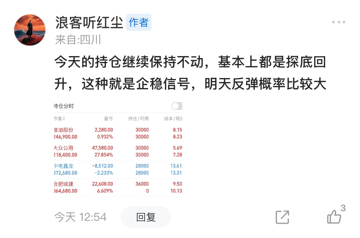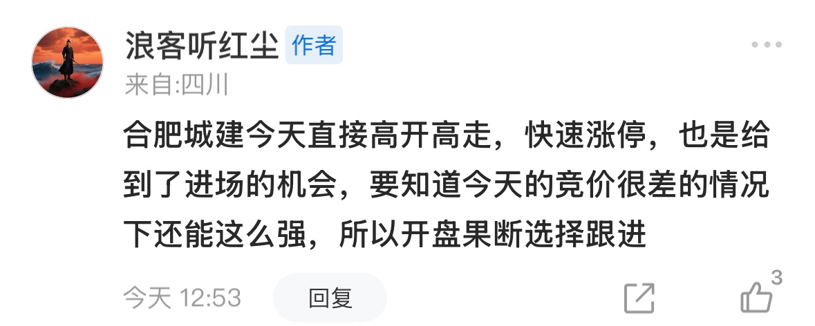 $合肥城建(SZ002208)$公司在合肥核心区域土地储备充足,与国资企业合作降风险,营收同比大增,受益于地产政策宽松。今天早盘逆势高开,所以今天的竞价我认为是超出我的预期,所以果断开盘价挂单,开盘后向下快速回落后马上拉起来,并且成功涨停,今天缩量涨停,而且还是逆势上涨,说明当前的行情已经是企稳了。