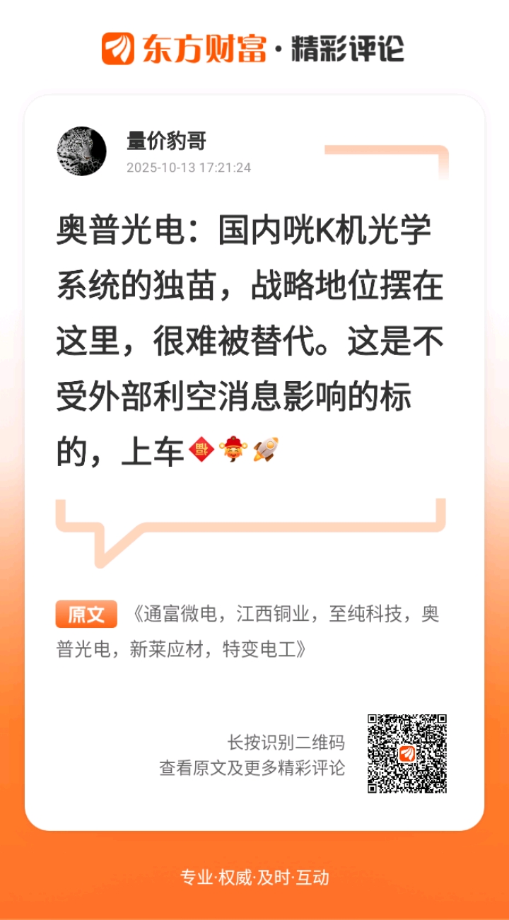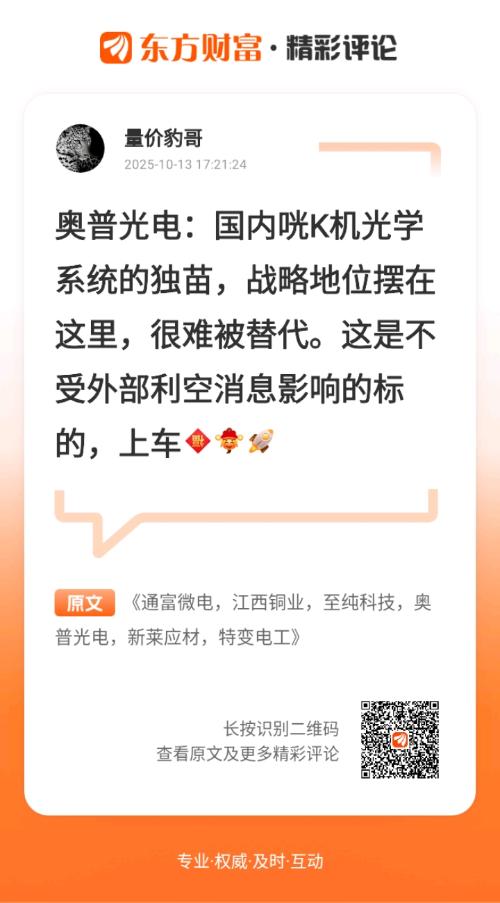 //@量价豹哥 :奥普光电:国内咣K机光学系统的独苗,战略地位摆在这里,很难被替代。这是不受外部利空消息影响的标的,上车